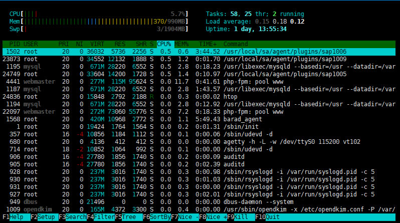 PID USER PR NI VIRT RES SHR S %CPU %MEM TIME+ COMMAND 1103 mysql 20 0 971248 85296 9384 S 0.0 17.1 0:40.12 mysqld 497 root 20 0 338536 35428 8956 S 0.0 7.1 0:02.74 firewalld 881 nginx 20 0 165692 18760 7688 S 0.0 3.8 0:01.68 php-fpm 838 root 20 0 562400 18484 7792 S 0.0 3.7 0:14.14 tuned 658 root 20 0 113384 18468 5984 S 0.0 3.7 0:00.04 dhclient
