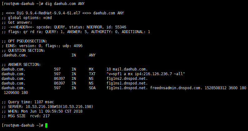 可以看到,”daehub.com”域名下存在一条MX记录。当然,如果对于DNS记录类型不熟悉的话,可以使用ANY参数将域名下的所有记录统一显示出来,如下所示:
