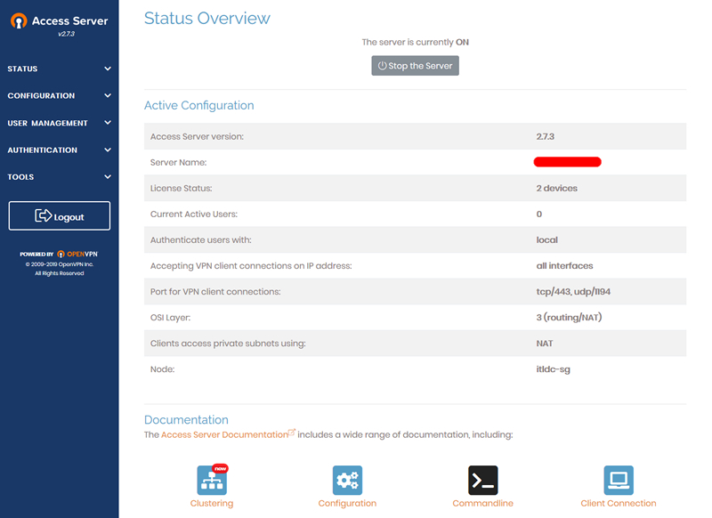 说是管理页面,其实AS的配置已经做的非常完善了,我们基本不需要修改其中的配置。修改的话也比较简单,基本都是些开关选项,需要设置数据的内容较少。示例起见,本次就保持默认配置不做修改。从状态页可以看出,此次安装的AS服务器含有两台设备的授权,同和客户端使用tcp/443和udp/1194端口通信。