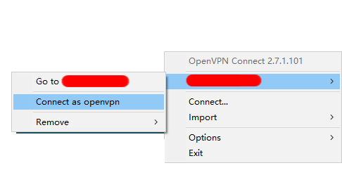 AS服务器导入成功后,客户端会显示该服务器,点击该服务器的菜单基,然后点击”Connect as openvpn”,就会弹出对话框要求输入密码: