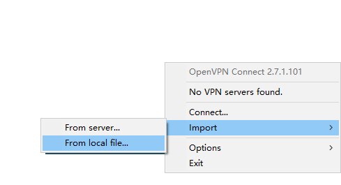 点击”Import>”菜单项中的”From local file…”菜单,就会弹出对话框,请求选择配置文件,这时选择之前从AS端下载的”client.ovpn”文件导入,就会把之前创建的AS服务器导入客户端,以便客户端连接使用。