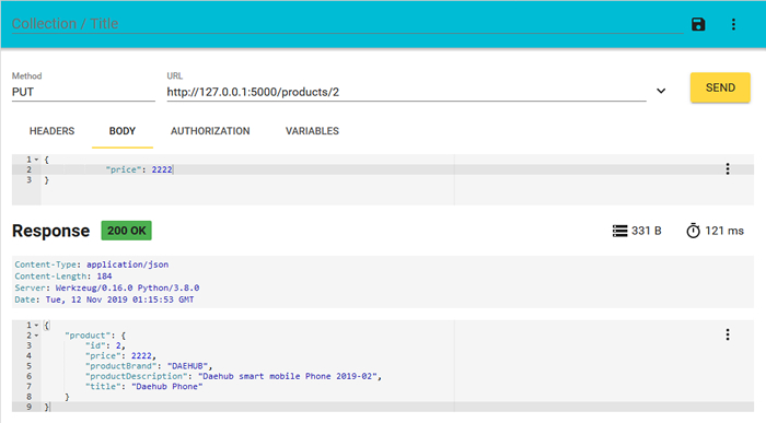 现在,想要把”id”为2的产品价格修改为2222,则同样使用浏览器插件发送”PUT”请求: