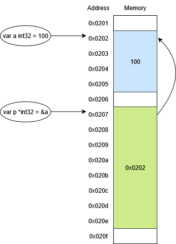 var a int32 = 100 var p *int32 = &a // p now holds the address of a fmt.Println(*p) // prints the value at the address p points to, which is the value of a: 100