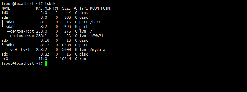 可以看到,主机目前具有两个LVM,其中root是在安装系统时生成的,挂载到根目录;另一个Lv01是新添加的LVM,挂载到/mydata目录。另外,主机还安装了一块空白磁盘”sdc”,我们将要做的就是用”sdc”磁盘替换Lv01中的”sdb”磁盘,以达到安全移除LVM磁盘的目的。注意所有操作都是联机进行,并不会对系统产生任何影响。