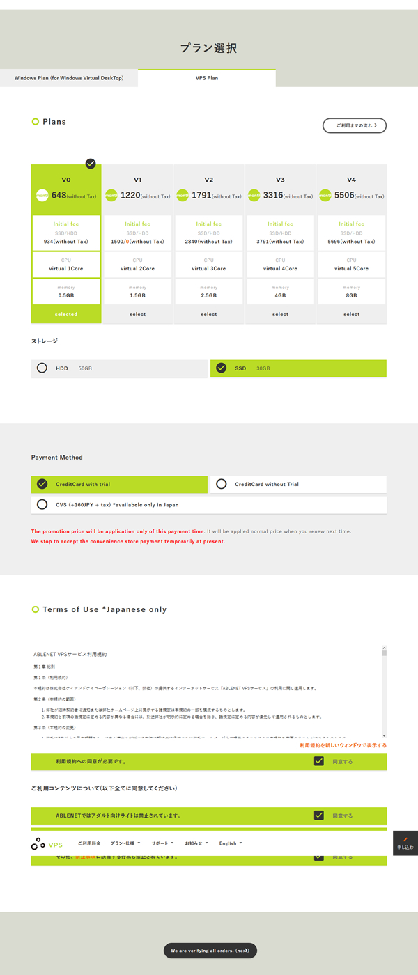 首先登录主页,看到一大堆日文也不要慌,进入 VPS 页面后直接点最上面的那个”申***”,想来就是申请的意思,之后就会进入VPS选择页面,选择最便宜的 v0 方案,一个月大概650日元,不到50块人民币的样子,不过首月需要付初始化费用,所以第一个月大概要花120多。